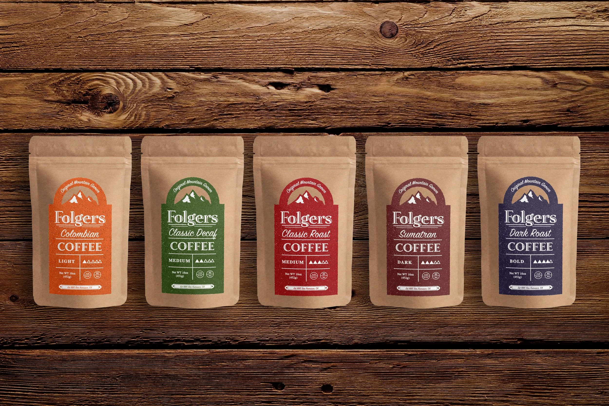 The purpose of the Folgers re-brand is to take their coffee out of the plastic red can, and into a new and rustic eco friendly package. Folgers was originally founded to supply coffee to gold miners during the gold rush of 1849, in turn they were one of the first suppliers of mass produced pre-ground coffee in the world. In 1885 they became a commercial supplier of coffee in the United States.
