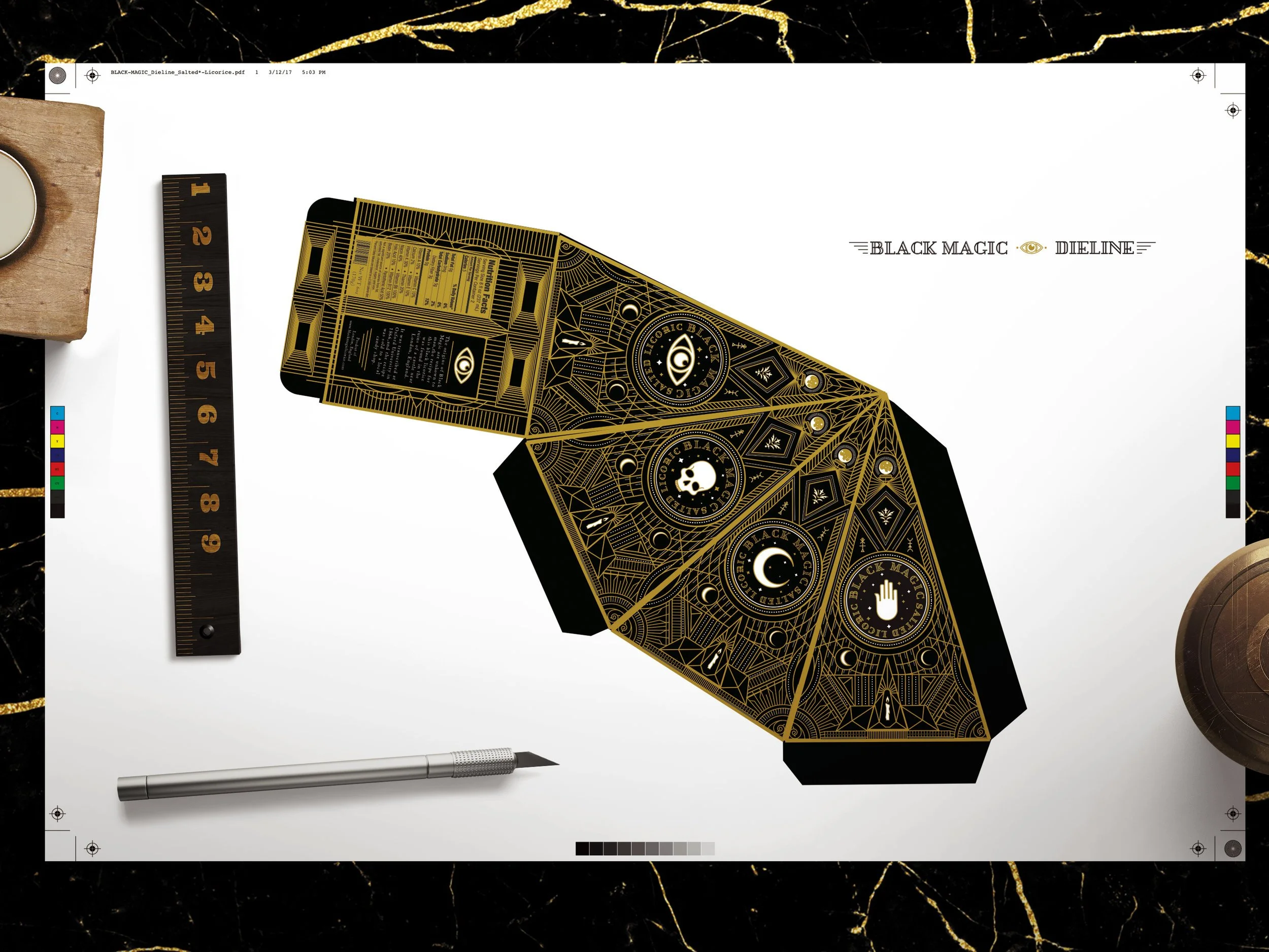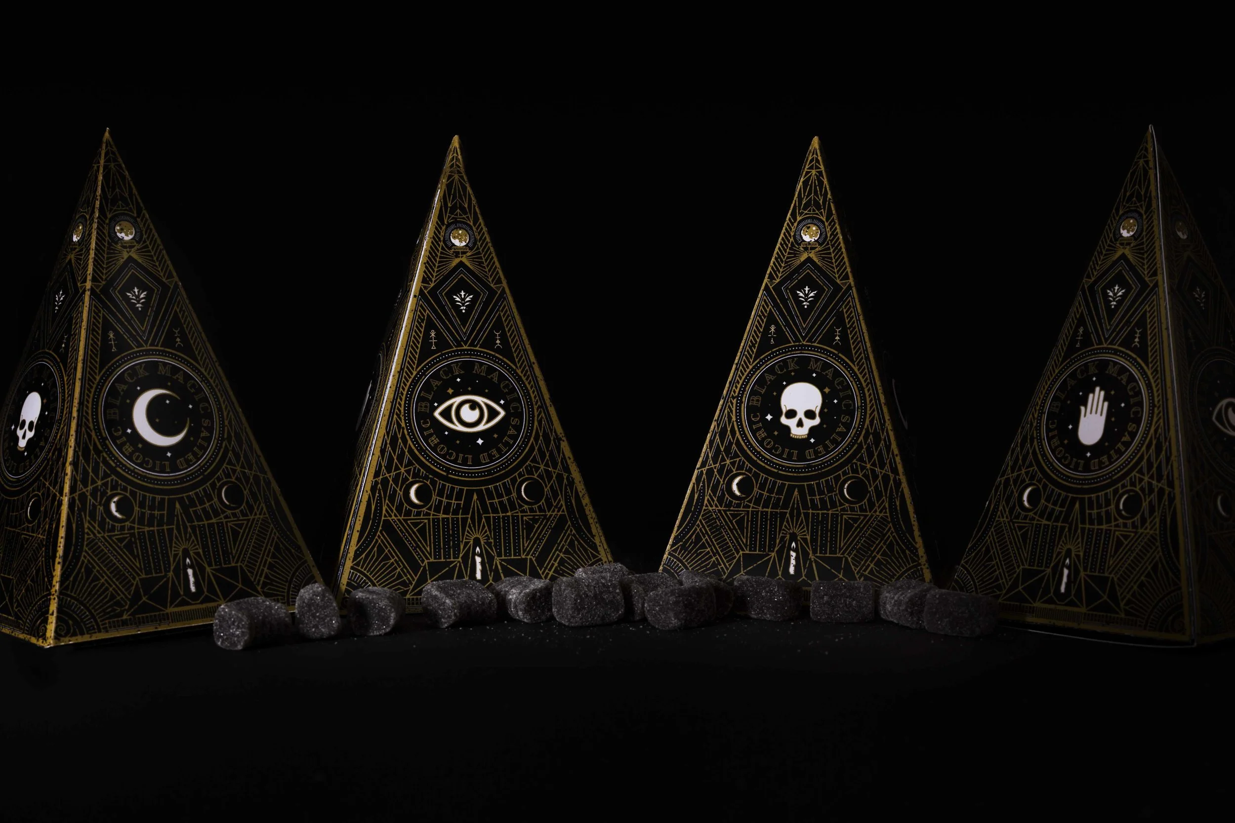 The Concept: Black Magic is a botique salted black licorice company based in London, England. The packaging is inspired by the occult, ouija boards, and black magic itself. The triangular packaging is a custom dieline which was then cut out and photographed